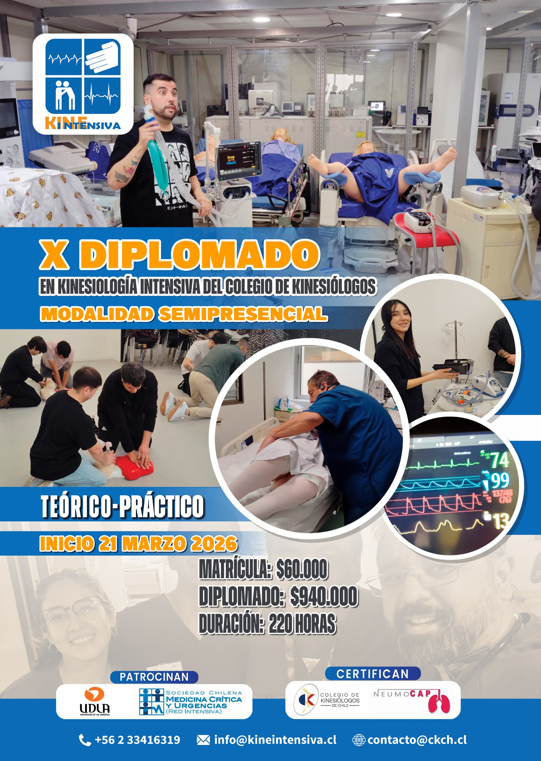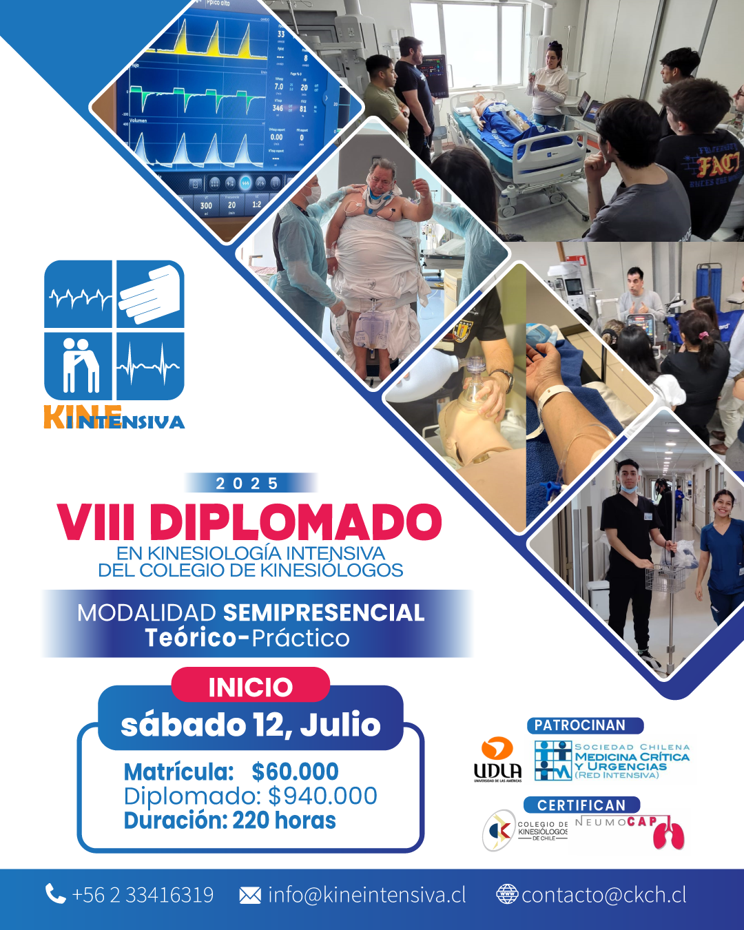 Este diplomado está especialmente creado para la adquisición de conocimientos ycompetencias que se requieren para el adecuado desempeño profesional con pacientes con alteraciones cardiorrespiratorias, especialmente de Unidades de Paciente Crítico, diseñado con un sentido formativo específico y que considera laformación presencial, teórica y práctica. Esta formación en Kinesiología Intensiva, es unDiplomado de 220 horas certificado por el Colegio de Kinesiólogos de Chile con patrocinioUniversitario y de la Sociedad Chilena de Medicina Crítica y Urgencias, especialmentediseñado para Kinesiólogos interesados en formarse en el área Hospitalaria conexpectativas de especialidad en Kinesiología Intensiva. Con 15 años de experiencia,desde el año 2008, esta instancia de capacitación de postítulo permite formación profesional centrada en la adquisición de conocimientos fundamentales para lavaloración y manejo del paciente crítico, con énfasis en el desempeño práctico, lo que la ha hecho merecedora de reconocimiento a nivel académico y profesionalque ha permitido ser considerado como requisito mínimo para optar a oportunidadeslaborales en muchos centros hospitalarios de nuestro país. Adicionalmente, esteDiplomado es una alternativa de un costo significativamente menor a otras de similarescaracterísticas.
